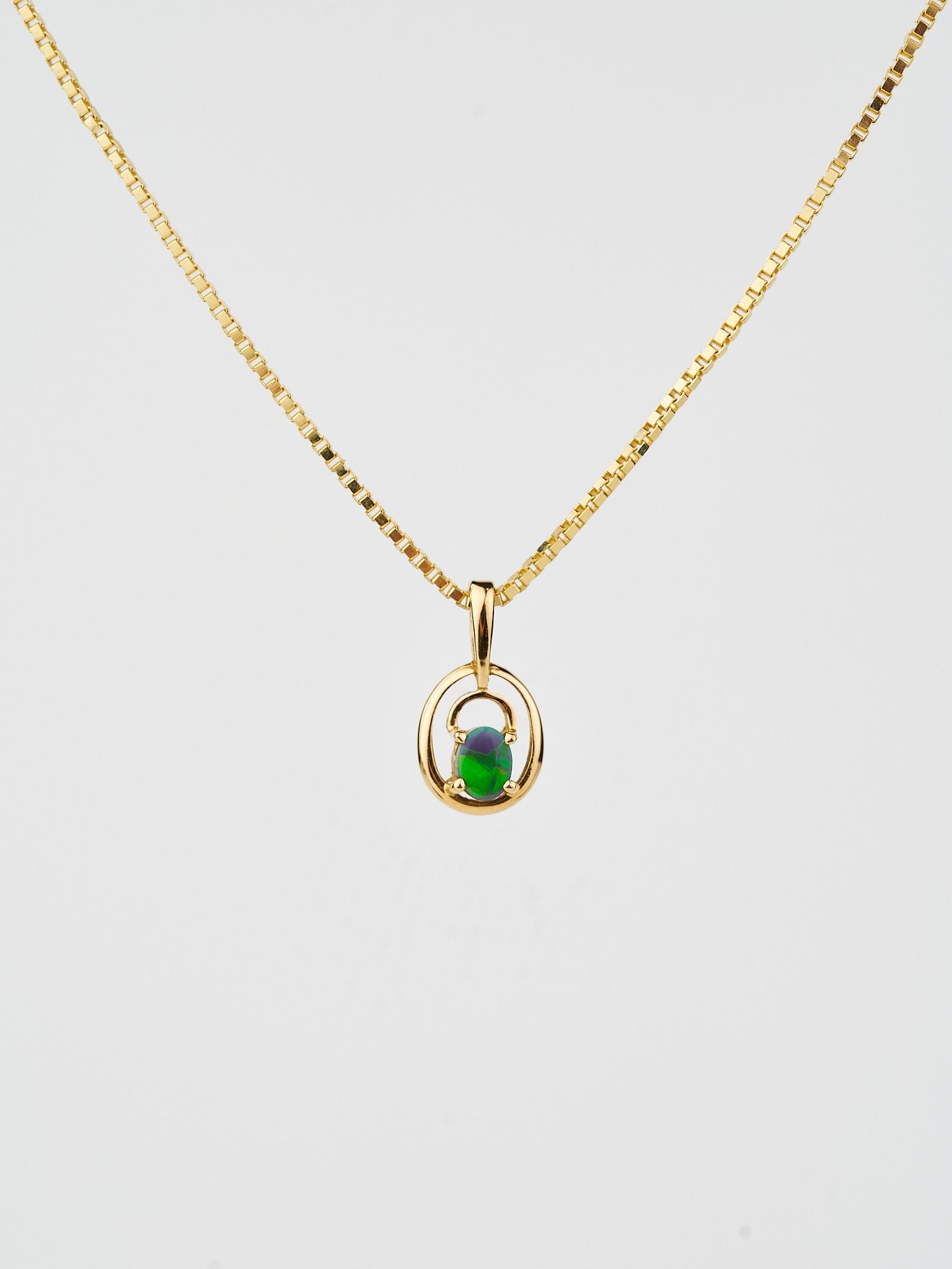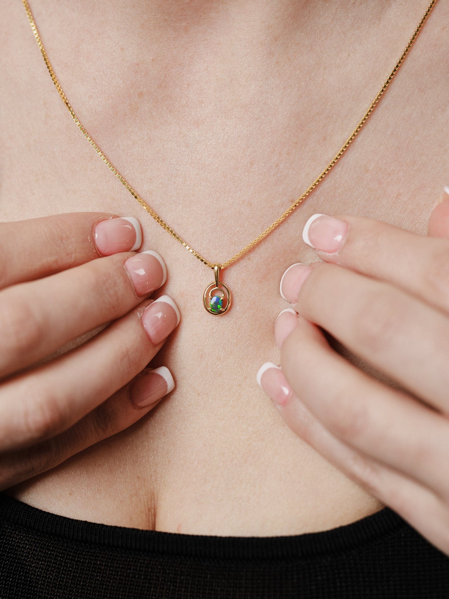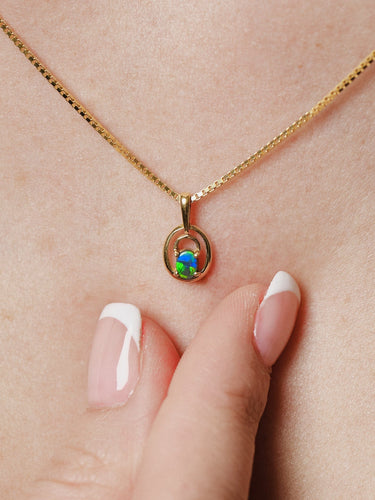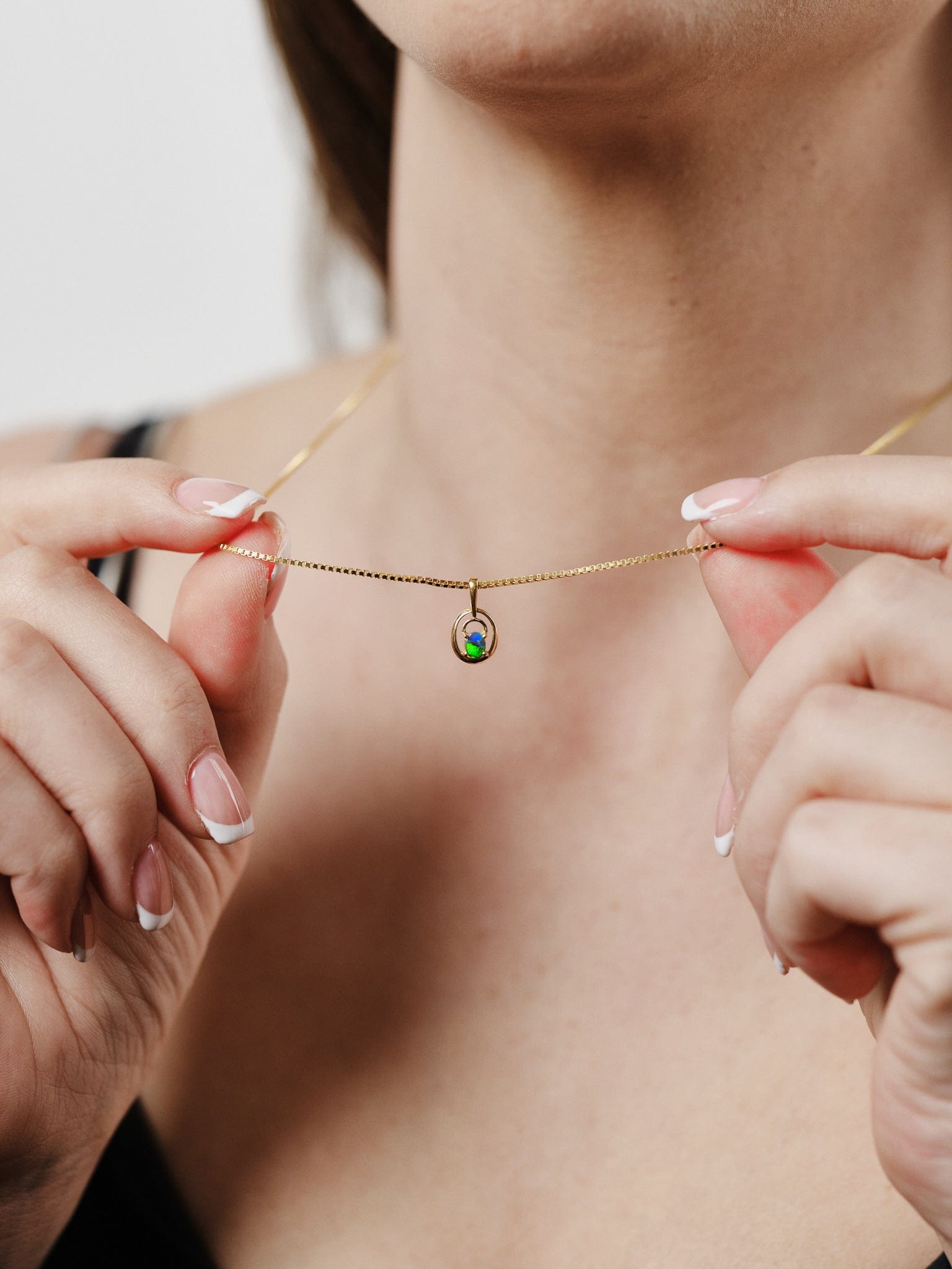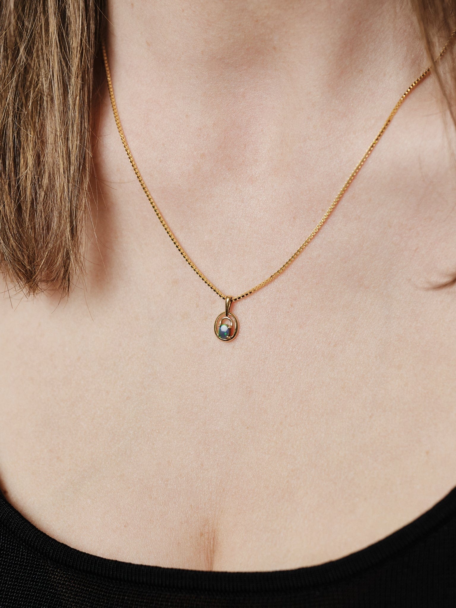 This is quite a dark Opal which gives it a phenomonal backdrop to see those beaitiful 'Play of Color' Irresdescant flashes. The Opal sits between two halos which show a planetary, celestial style that is still very dainty. Made from 18k Solid Gold this pendant is stand alone. The chain is not included. Please get in contact with us if you would like a matching solid gold chain sourced for you!