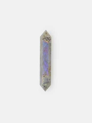 Crystal Wand Important Details: Purple Labradorite is part of the Feldspar Mineral Group. It has a sheen known as labradorescence which means the crystal has a "flash" of colour only. Depending on the angle and when the crystal hits the light the wand will show flashes of colour, otherwise its body colour is a light grey/green. Please also note the wand does not only flash in Purple. Although there will always be a glint of purple in your wand it could flash gold/orange/aqua too. The body colour is lighter green in comparison to the Peacock Labradorite wand which mostly flashes blue/green.