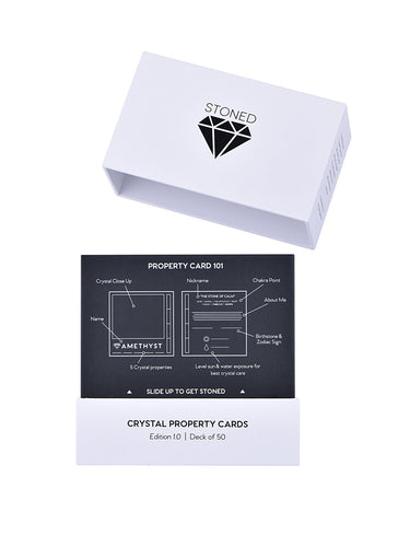 The Official Stoned Crystals Property Card Deck holds 50 unique cards. Edged with Silver Lining, each card details the crystals’ properties, appearance. Chakra points, birthstone and crystal care.